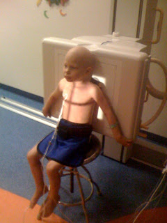 Although Logan is feeling miserable he still has time to sing. The above video is him humming and then giving the camera a wink. He is feeling horrible still w/ a lot of pain. Nausea seems to be under control as well as pain. He is sleeping a lot which is o.k. He is on a continuous does of morphine and the when the pain gets worse they give him a little boost of more. Today we also go get our weekly x-ray to make sure no fluids in chest/lungs. We have not heard anything so no news is good news. I put pictures of him doing great at the x-ray as well as him lying in bed.