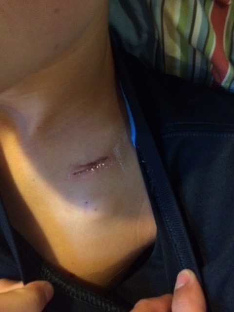 Logan is in a lot of pain but otherwise in great spirits. We are trying to control pain as much as possible to make him comfortable. The area that hurts the most is where they placed the port. As you can see by the above picture they made small incision and placed under his skin about 1 inch below. Once the skin scars/heals around it it should feel better. The purpose of the port is when they do need to give him medicine, draw blood in the future they will access that vs. sticking him with needled all the time.
